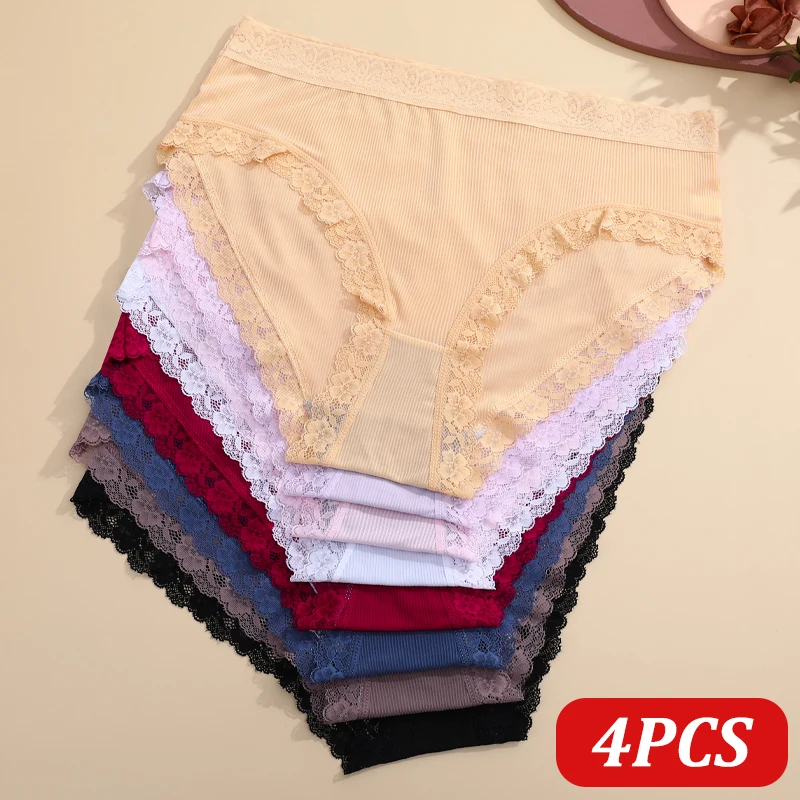4PCS Sexy Lace Plus Size Elastic Panties For Women Solid Color Mid Waist Seamless Underpants Female Comfortable Lingerie L-4XL