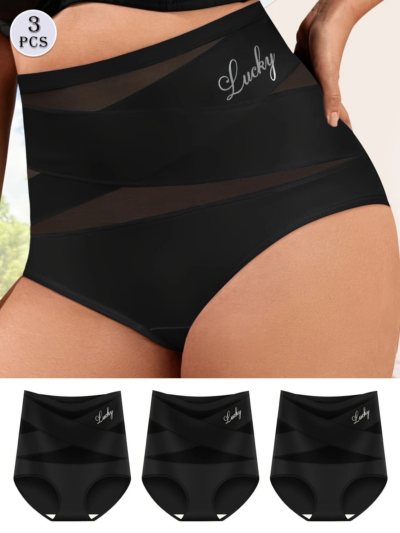 3pcs Women's Plus Elegant Panties, Plus Size Letter Graphic Cross Detail High Waisted Tummy Control Breathable Mesh Briefs