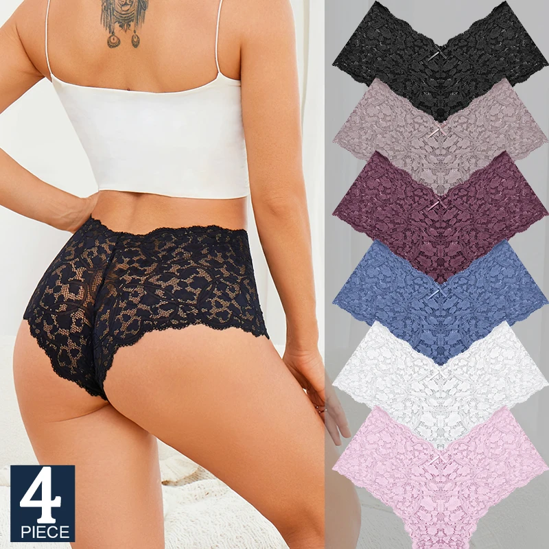 FINETOO 4Pcs Lace Floral Boyshorts Underwear for Women Sexy Hollow Out Solid Panties Female Low-Waist Breathable Girls Lingerie