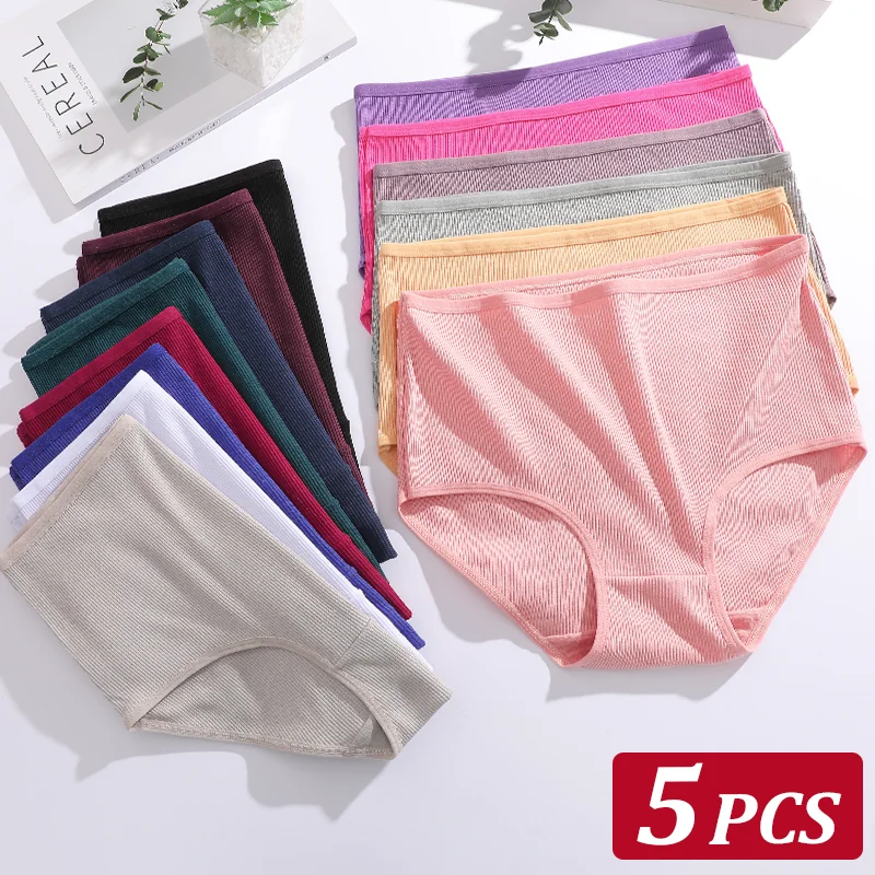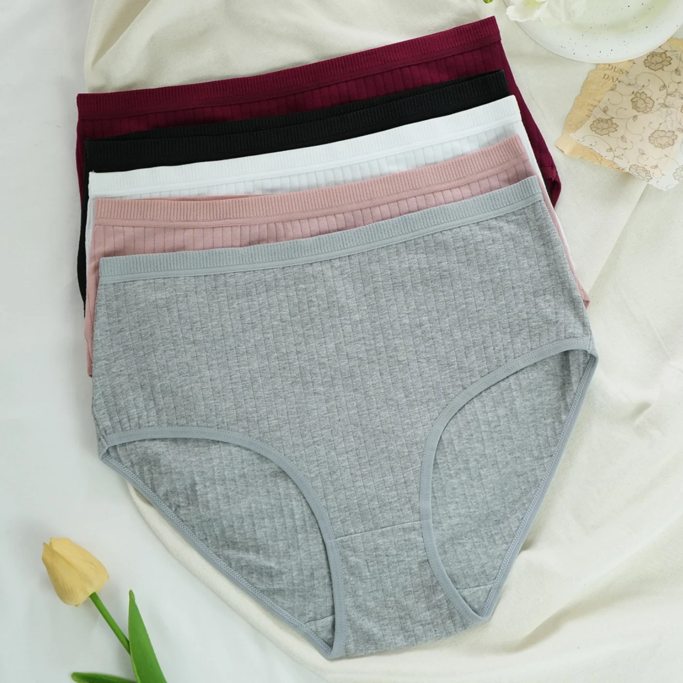 4Pcs/Set Women's Ribbed Striped Cotton Briefs Plus Size Panties Lady High Waist Breathable Underwear Solid Lingerie Shorts S-XXL
