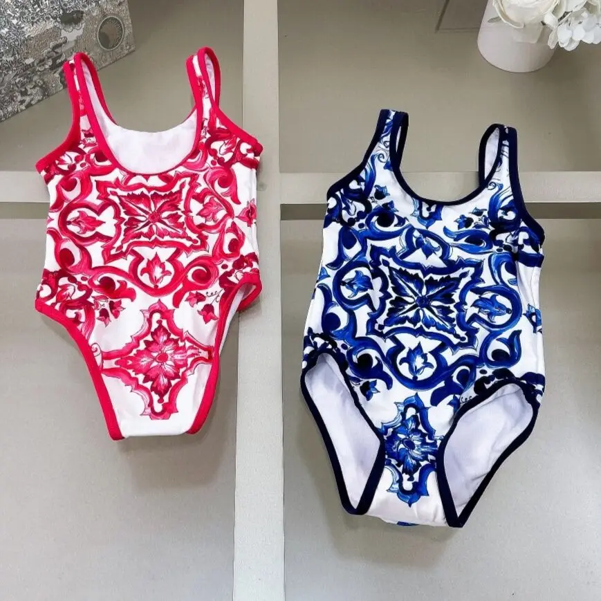 Girls classic style blue and red patterned camisole jumpsuit summer new girl's one-piece Timeless Classic Popular with swim hat