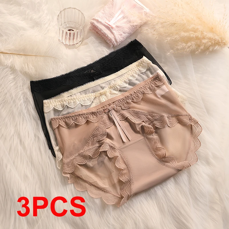 3Pcs Ice Silk Lace Panties Seamless Soild Underwear For Women Sexy Ultra-thin Breathable Briefs Girls Soft Transparent Lingerie