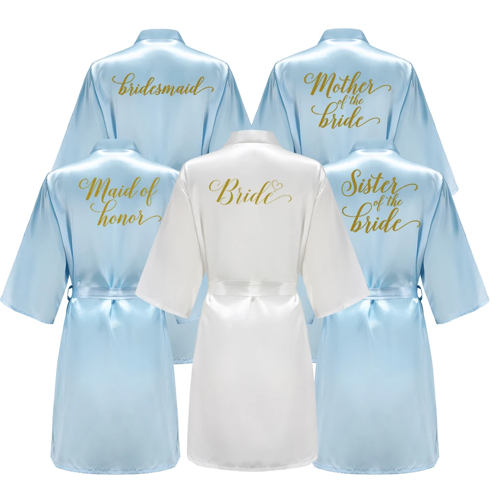 Blue Bride Bridesmaid Robe With Gold Letters Mother Sister Wedding Gift Bathrobe Satin Kimono