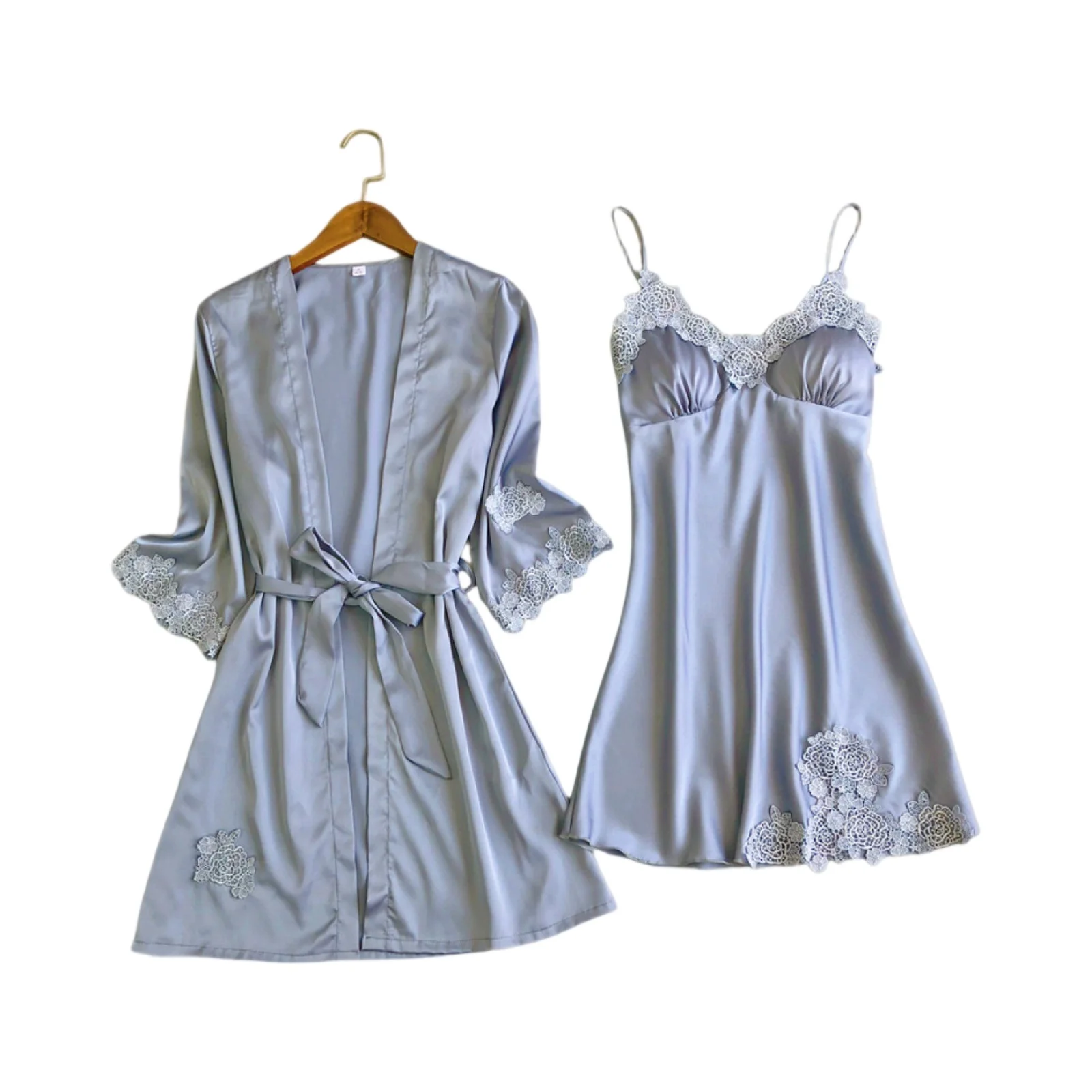 Sexy Women Home Dressing Gown Lingerie Lace Patchwork Satin Robe Set Nightwear Casual Sleepwear Kimono Bathrobe Home Nightdress