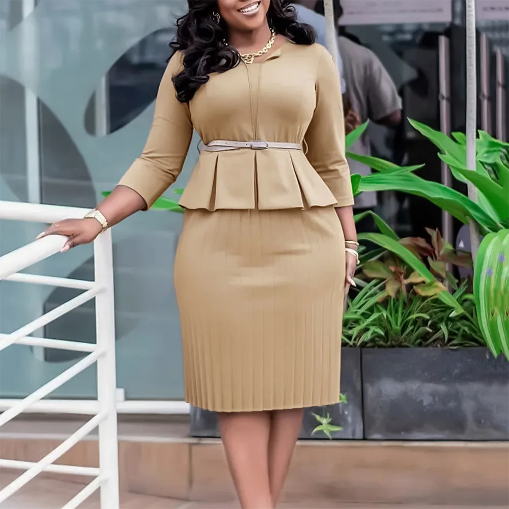 Elegant Office Dress for Women Professional 2024 New V Neck Three Quarter Sleeve Belt Waisted Mid Calf Formal Business Work Robe