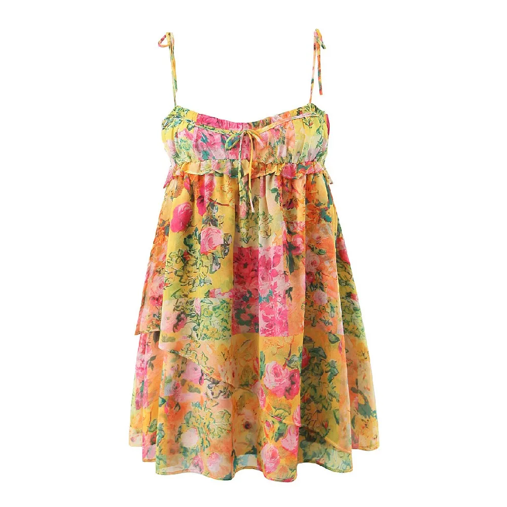 Women Bow Lacing up Sling Robe Holiday BOHO Ruched Chest Orange Flower Print Spaghetti Strap Mini Dress