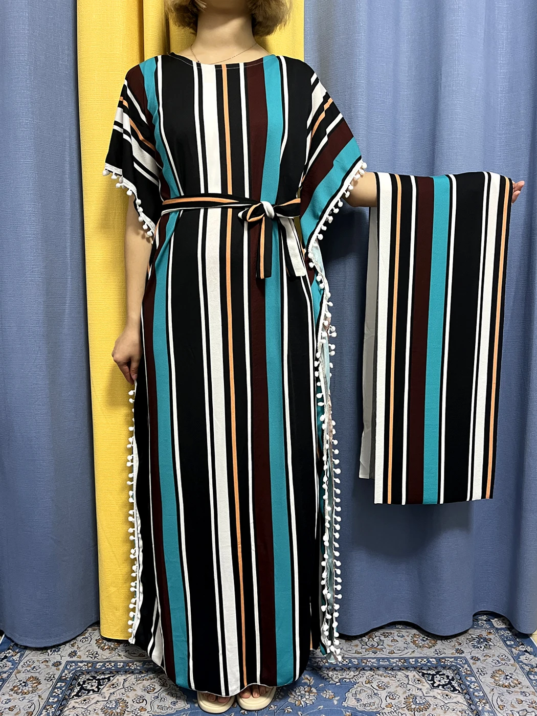 Abayas For Women 2024 Printed Vertical Stripe Tassels Elasticity Loose Fit Femme Robe African Woman Dresses With Belt Headscarf  Read more