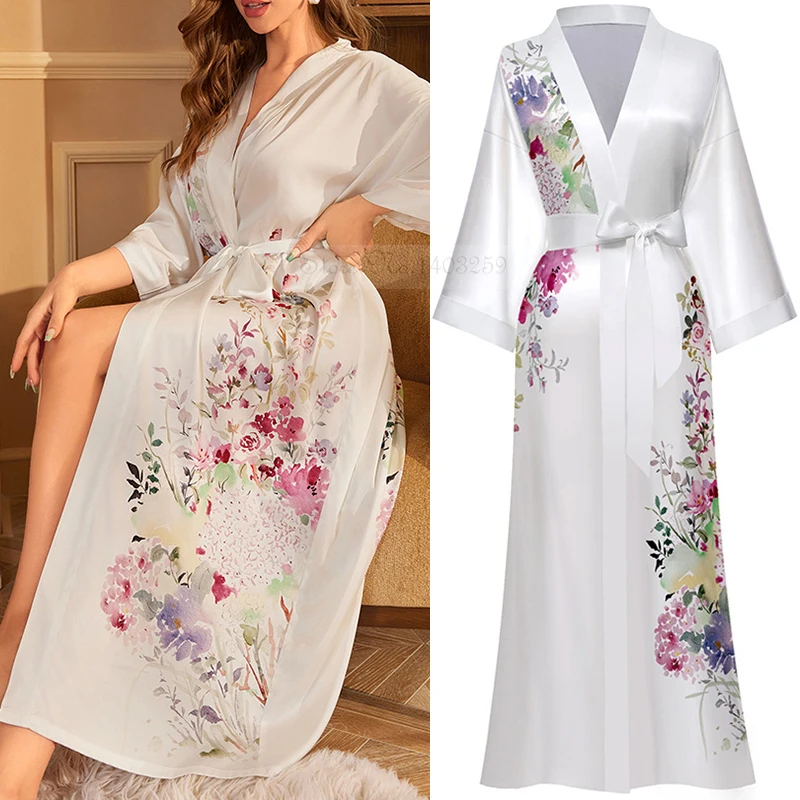 Print Flower Long Robe Wedding Half Sleeve Kimono Bathrobe Gown Spring Summer Female Sleepwear Nightgown Loose Satin Home Dress