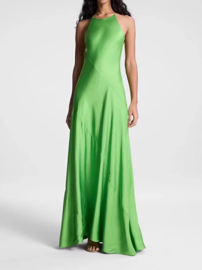 Off-Shoulder Women Green Maxi Dress Round Neck Sleeveless Elegant Slim Robe