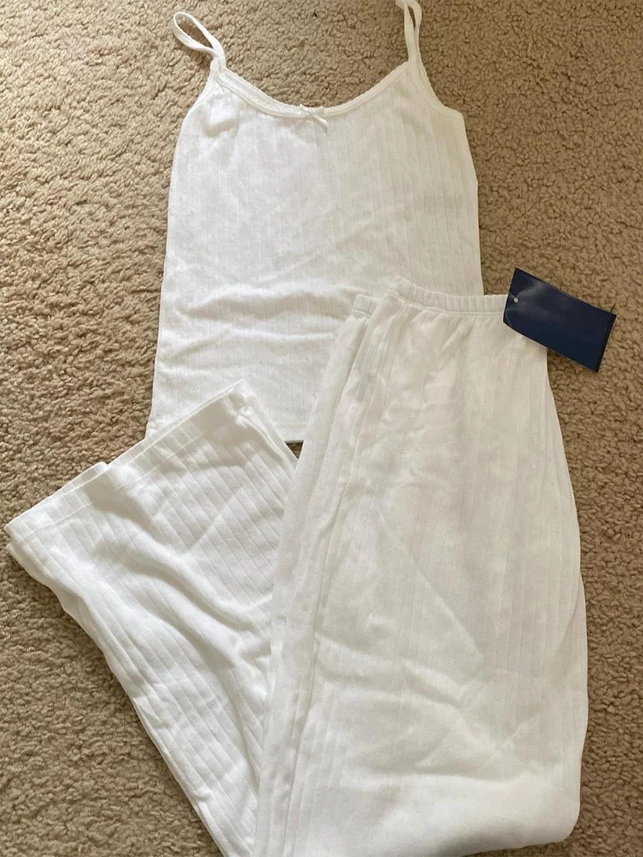 Eyelet White Tank Pant Home Set Woman Bow Slim Crop Top+Elastic High Waist Straight Trousers Summer Cotton Pajama 2 Piece Sets