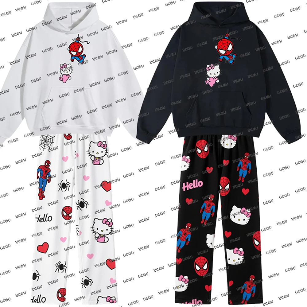 Hello Kitty&Spider-Man Autumn Winter Cotton Hooded With Pajamas Pants Oversized Set For Adult/Kid Men Women Hoodie Couple Hoodie