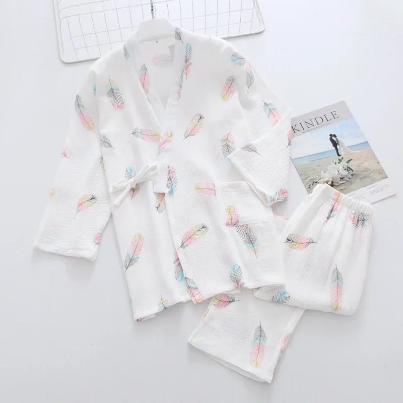Japanese kimono ladies spring and summer pajamas two-piece three-quarter-sleeved trousers cotton crepe lace home service set