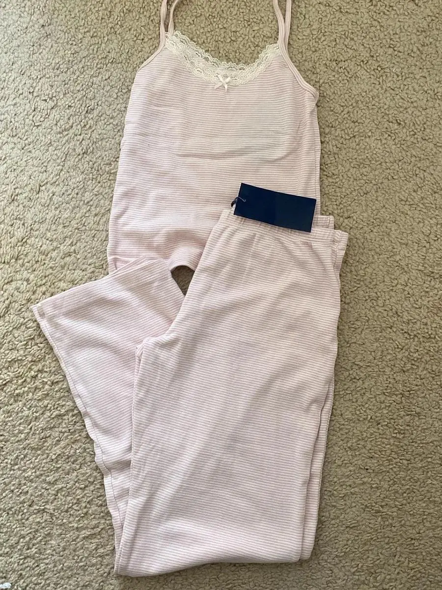 Striped Pink Vest Pants 2 Pieces Set Pajama Woman Lace Trim Bow Slim Tank Top High Waist Straight Long Pant Cotton Sweet Sets  Read more