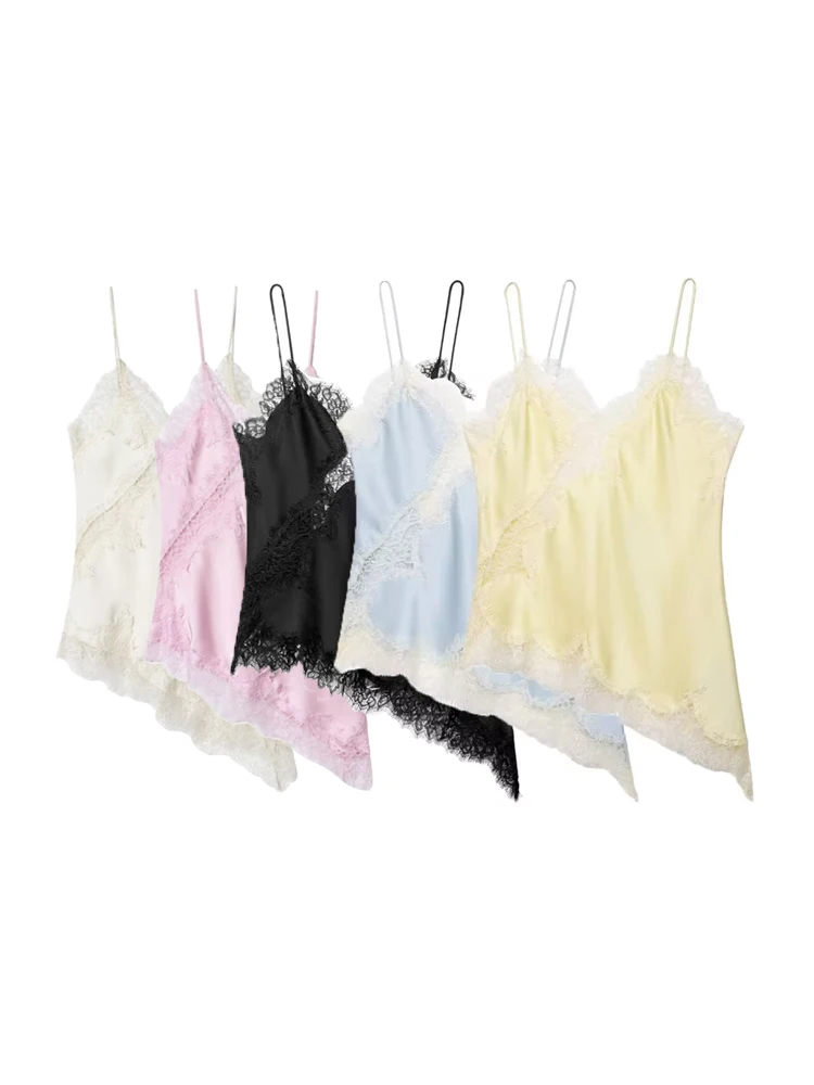 Women's Asymmetric Tank Top V-Neck Lace Appliques Thin Strap Camisole Fashion Female Top Mujer