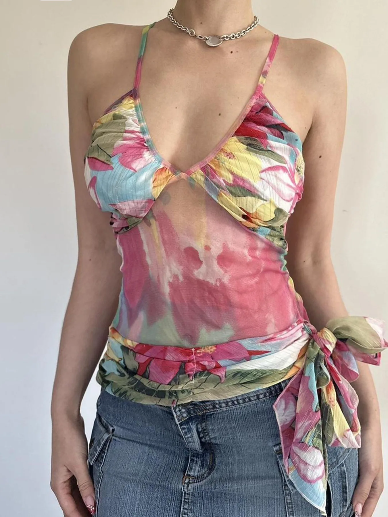Fashion Floral Prints Slim Fit Summer Women Vest Lace Up Causal Holiday Style Chic Trendy Camisole Tops