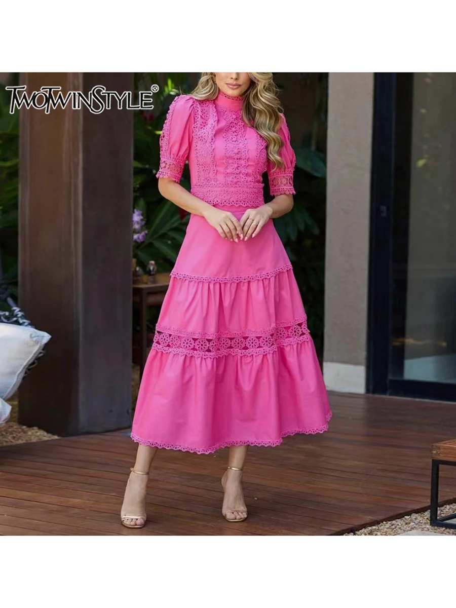 TWOTWINSTYLE Solid SlimmingTwo Piece Set For Women Turtleneck Short Sleeve High Waist Spliced Lace Elegant Sets Female New