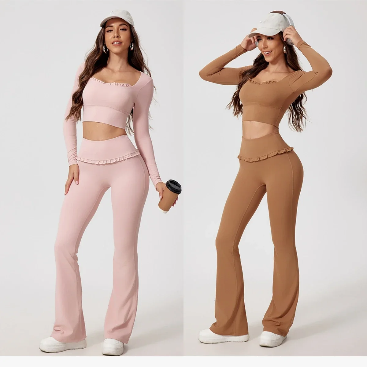 Yoga set with breast pad nude lace long sleeve quick drying high waist slim slim breathable micro-stretch yoga pants  Read more