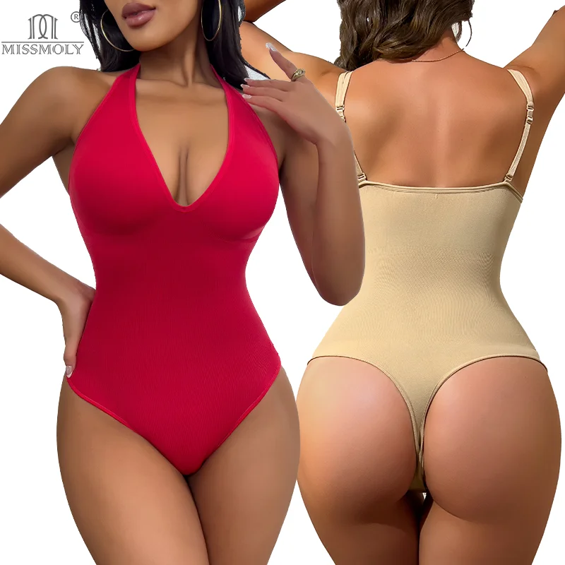 Miss Moly Deep V Bodysuit for Women Adjustable Strap Shapewear Halter Top Tummy Control Fajas Colombianas Thong Sexy Body Shaper