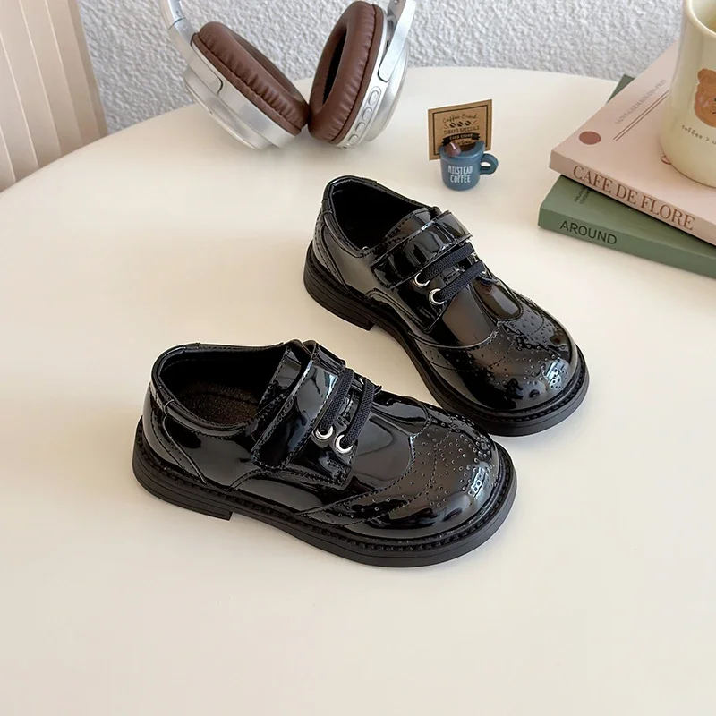 Kids Leather Shoes Black Glossy Girls School Uniform Shoes Retro Hook&loop 2025 New Boys Flat Shoes British Style Soft Sole