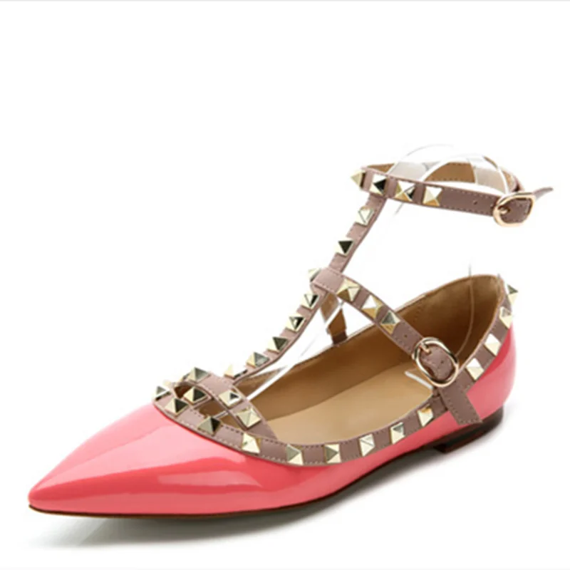 Lady Cross Dresser Flats Gold Studs Shoes Shiny Matte Mujer Tacons Plus Size 29cm 35-48 Watermelon Red Chaussures Desinger Brand