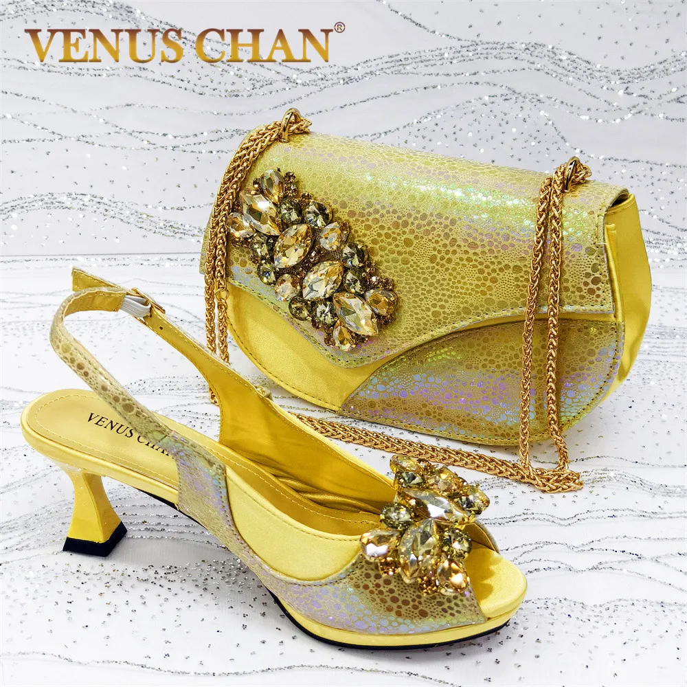 2025 Women's Elegant Yellow High Heel Shoe and Matching Bag Set with Rhinestone Accents – Stylish Square Toe Design for Parties