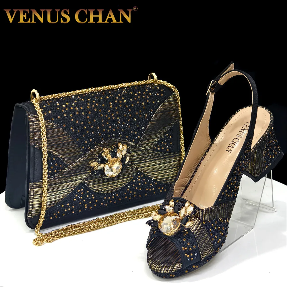 2025 Luxurious Italian Women's Party Shoe and Bag Set – Elegant Black Rhinestone Peep-Toe High Heels Sandals for Weddings