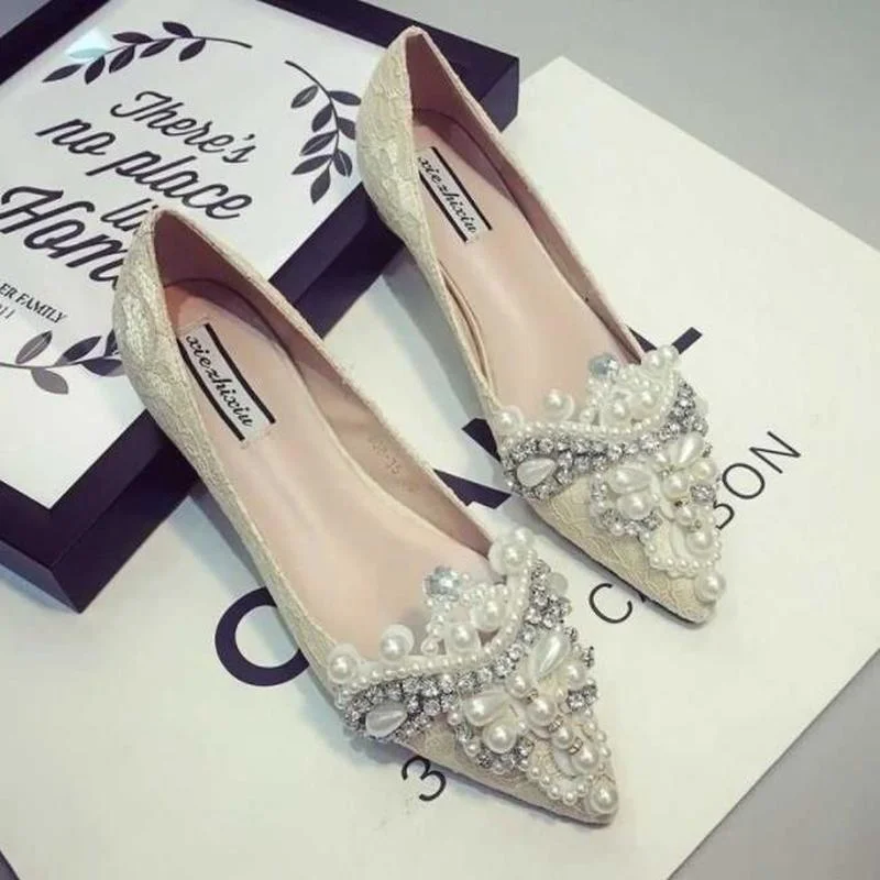 New Crown Pearl soft Flats Wedding Shoes Pointed Toe Women Dress Moccasins Low Pearl Heel Ladies Fashion Luxury plus size 43