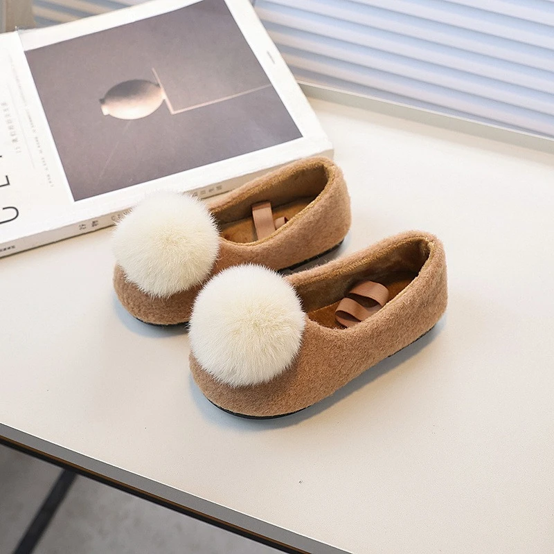 Winter Kids Causal Moccasin New Girls Plush Shoes Soft Hairball Children's Fashion Princess Flat Cotton Shoes Warm Furry Hairy