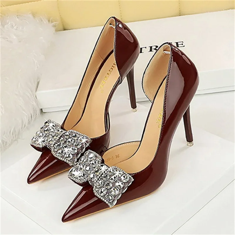 BIGTREE Sexy Party High Heeled Stiletto Heels Pointy Hollow Patent Leather Rhinestone Butterfly-Knot Women Pumps Shoes