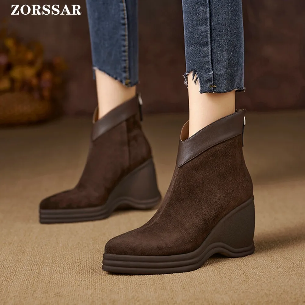 9cm Platform Wedge Hidden Heel Women Ankle Boots Suede Leather Warm Female Wedge Shoes Zipper Winter Shoes Sneakers 2025