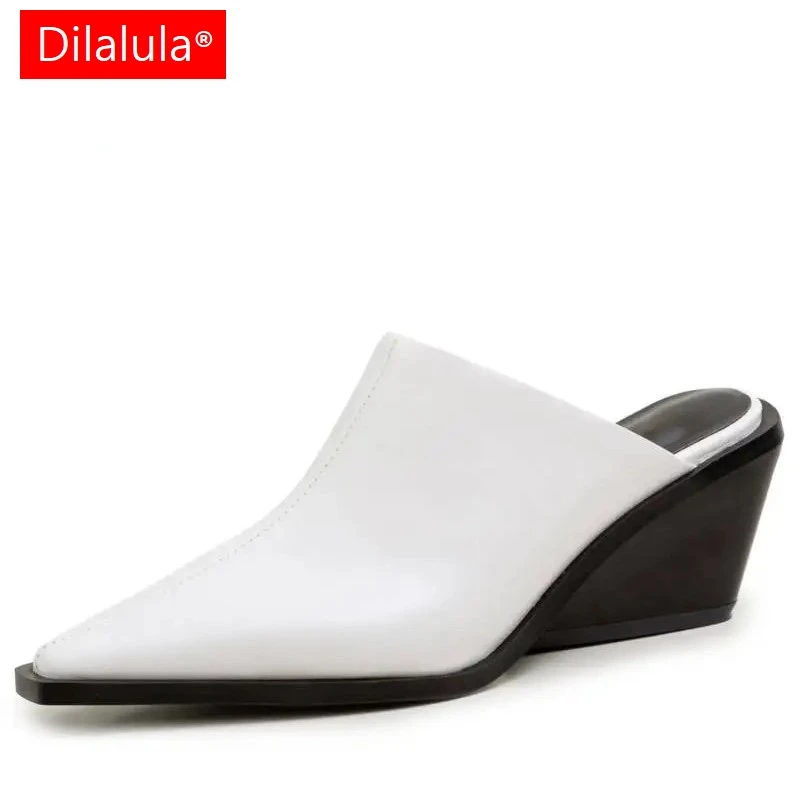 Dilalula 2025 Genuine Leather Women Covered Toe Mules Ladies Med Chunky Heel Summer Casual Wedges Slippers Office Sandals Woman