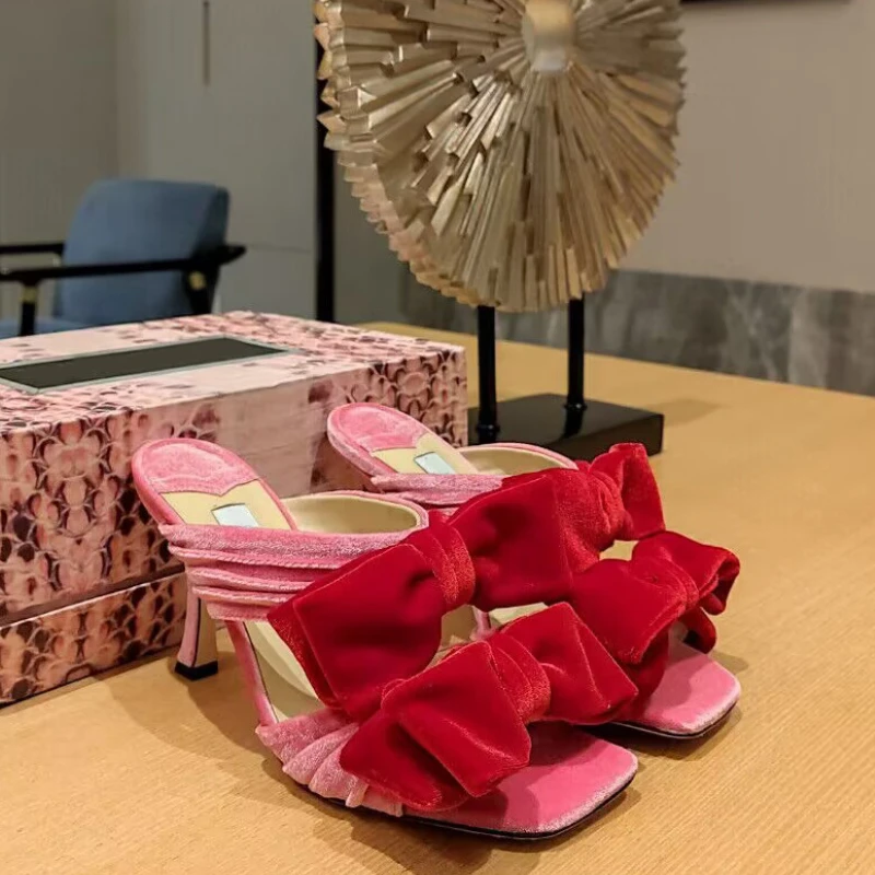 Bow Sugar Pink Pile Sandals 2024 New Lady Sandals Square Toe Open Toe Stiletto Black Heels