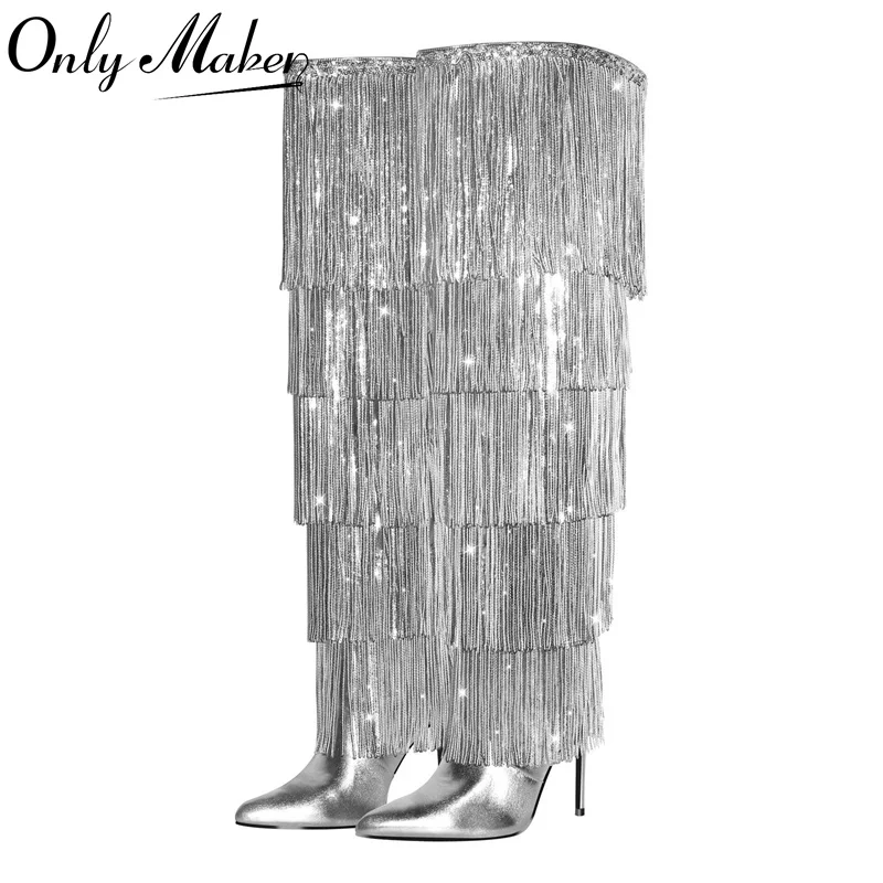 Onlymaker Women Sliver Pointed Toe Fringe Metallic Slim Over The Knee Boots Stiletto Dance Sexy Thigh Boots