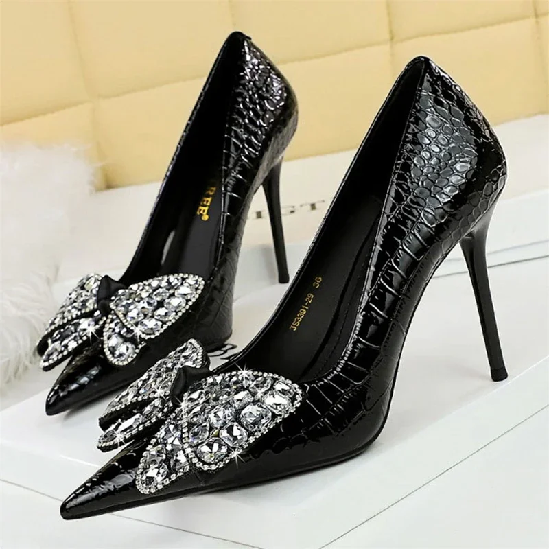 BIGTREE Spring Autumn Stripper Party Fashion Stiletto Woman Pumps Stone Patent Leather Shallow Pointed Rhinestone Heels
