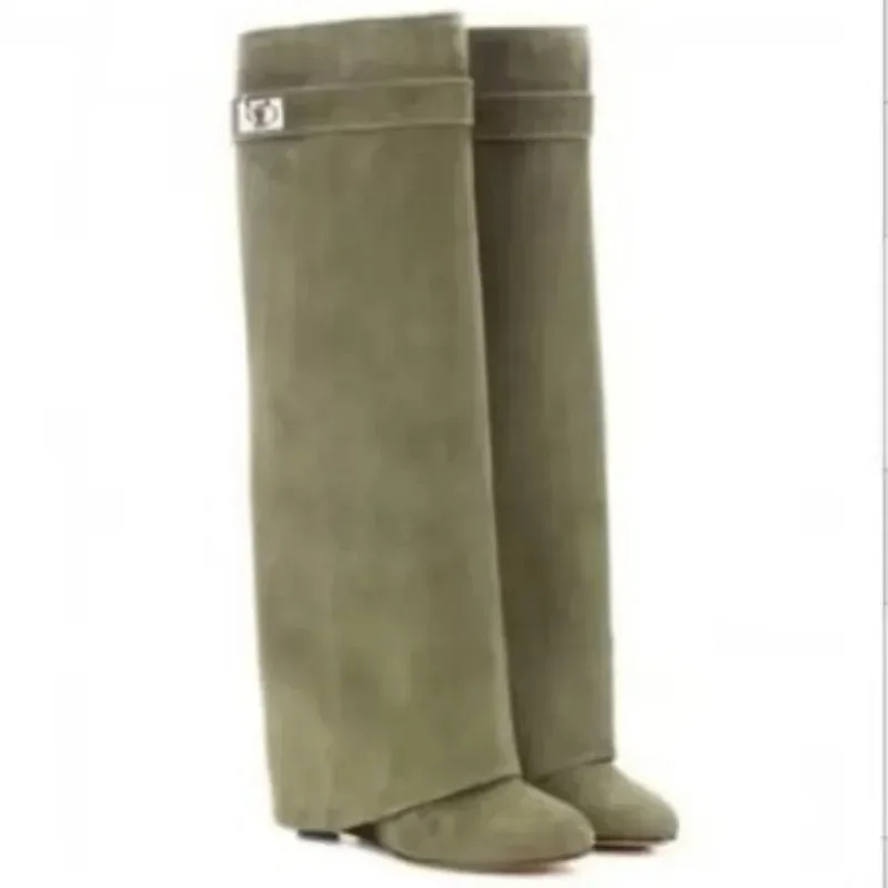 Women'S Suede Knee High Boots Open Round Toe Wedge Heel Slouchy Long Boots For Party