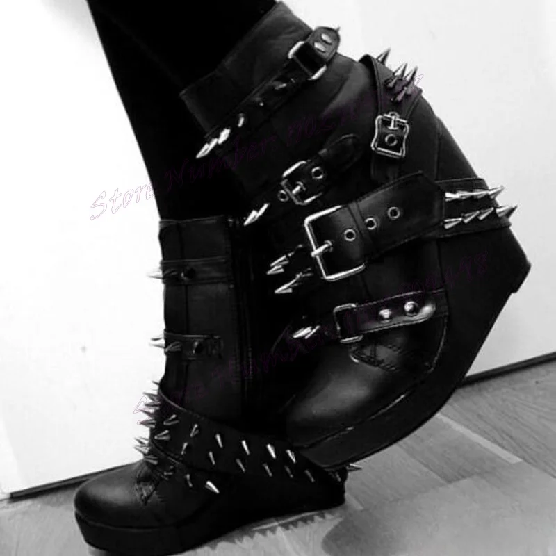 Black Strappy Rivet Wedges Heels Ankel Boots Round Toe Shoes for Women Matte Leather Punk Style Shoes 2024 Zapatos Para Mujere  Read more
