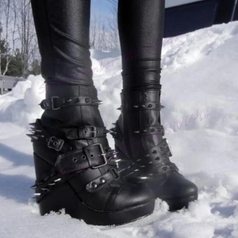 Black Strappy Rivet Wedges Heels Boots Buckle Round Toe Shoes for Women Punk Style Matte Leather Shoes 2025 Zapatos Para Mujere