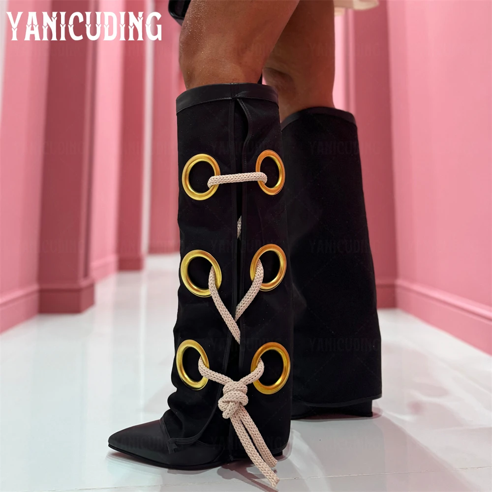 Round Buckles Canvas Knee Boots Elegant Style Pleat Wedge Boots Women's Fashion Style Hemp Rope Cross Strap Winter Boots Custom  Read more