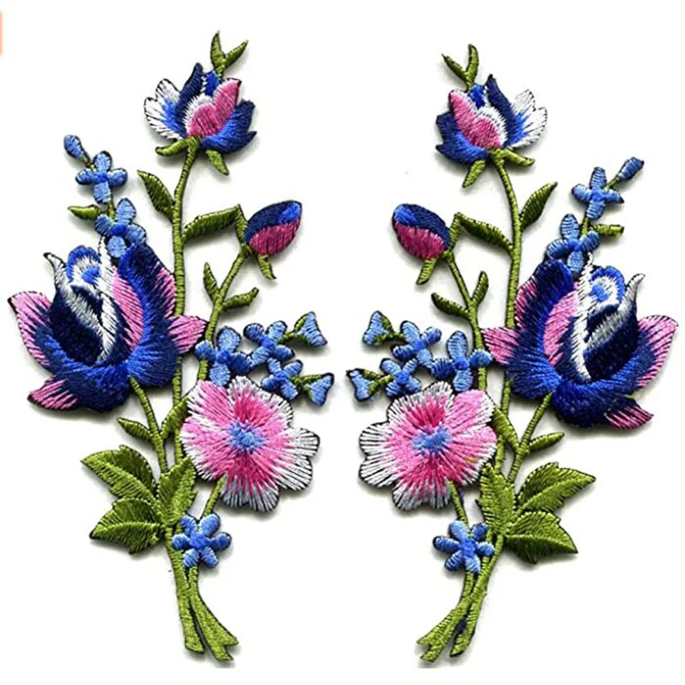 1 Pair Pink blue Roses Pair Flowers Floral Bouquet Boho Embroidered Appliques Iron-on Patches New
