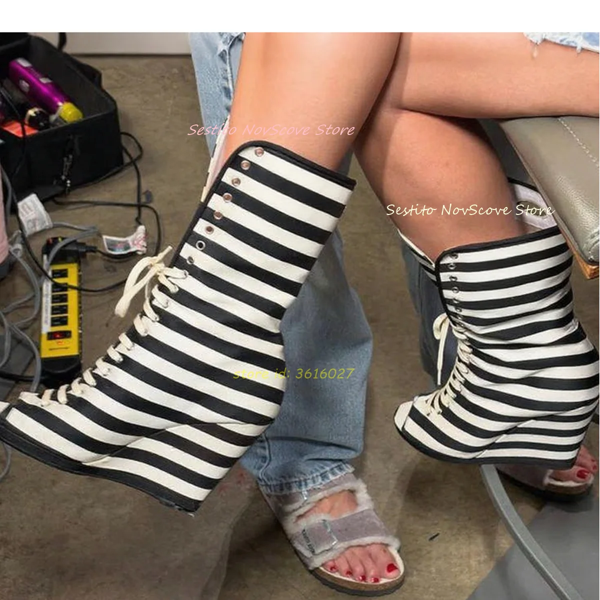 Black and White Striped Wedges Mid-Calf Boots Lace Up Peep Toe Sewing Vintage Cross Straps Sexy Women Autumn Party Short Booties