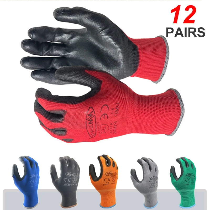 24 Pieces/12 Pairs Industrial Working Gloves 13 Gauge Knitted Red Nylon Dipped PU Nitrile Coated Palm Security Protective Gloves