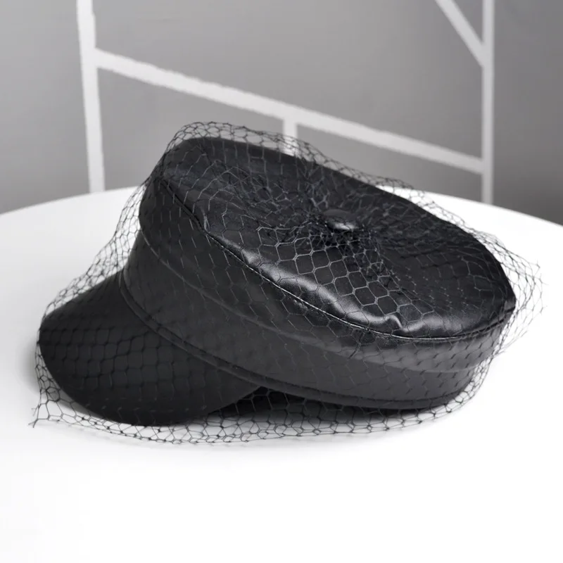 Spring and Summer New Black PU Lace Veil Newsboy Caps Fmale Flat Top Black Mesh Letter Multiple Styles Fashion Hats  Read more