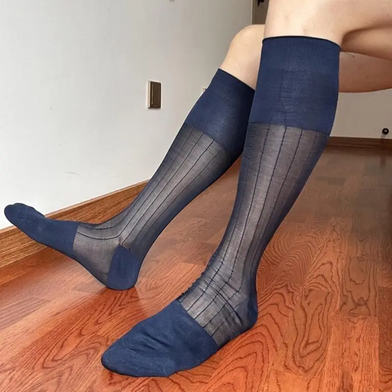 Mens Thin Dress Socks Over The Knee Formal Business Long Socks Man Sexy See Through Sheer Stripe Nylon Suit Thigh High Stockings