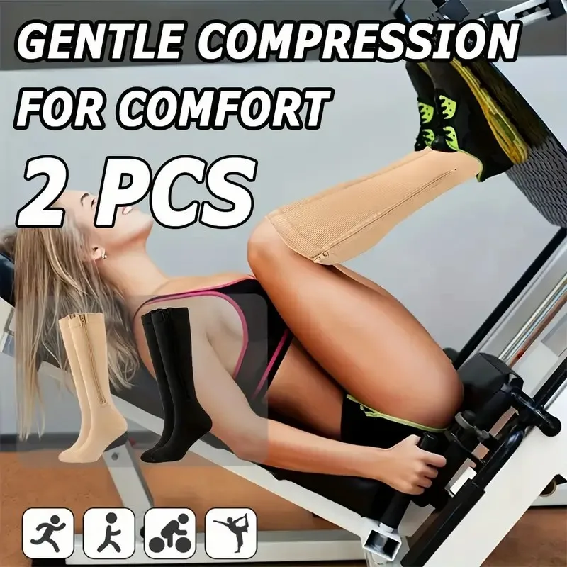 2 Pairs Neutral Sports Calf Compression Socks Fashionable Zipper Design Sweat Absorbing Breathable All Season Pressure Socks