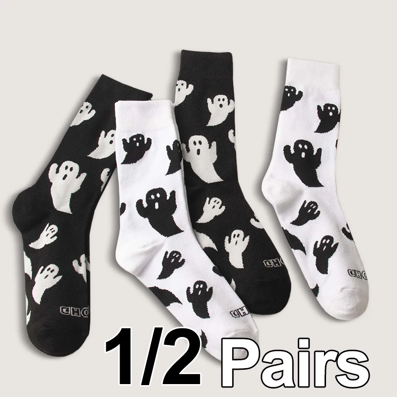 1/2 Pairs Neutral Halloween Fun Ghost Pattern Round Neck Socks Suitable All Seasons Sweat Absorbing Breathable Casual Socks