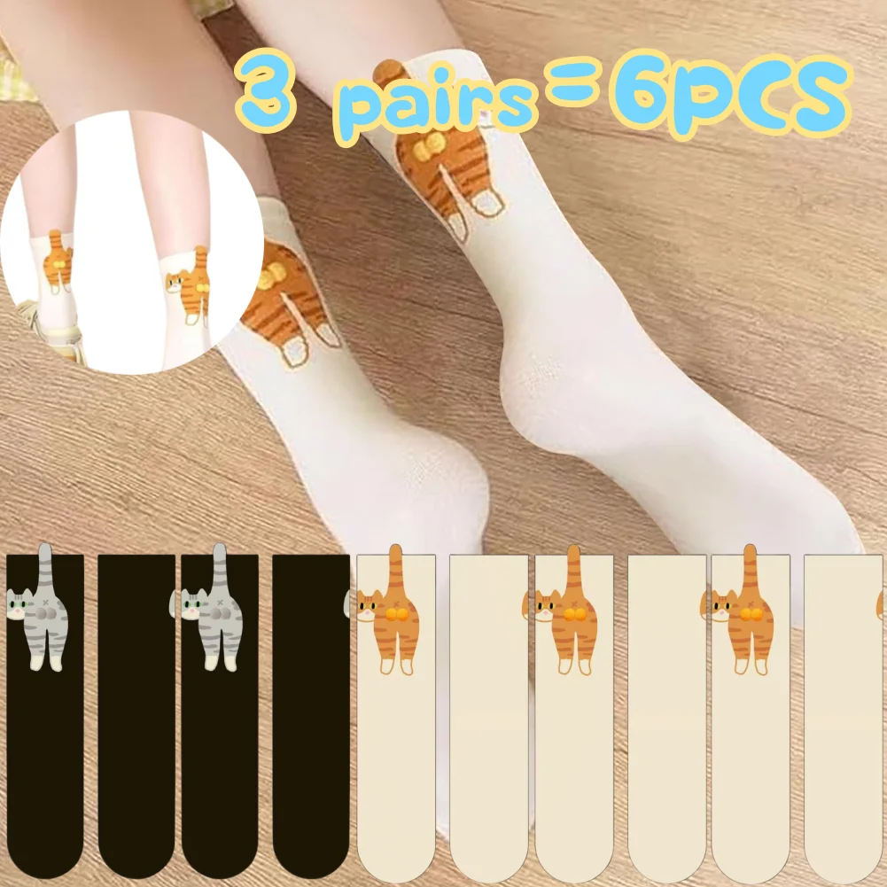 3pairs Summer Breathable Cute Cat Cotton Socks Funny Animal Crew Cats Middle Tube Socks with Balls Novelty Gifts for Cat Lovers