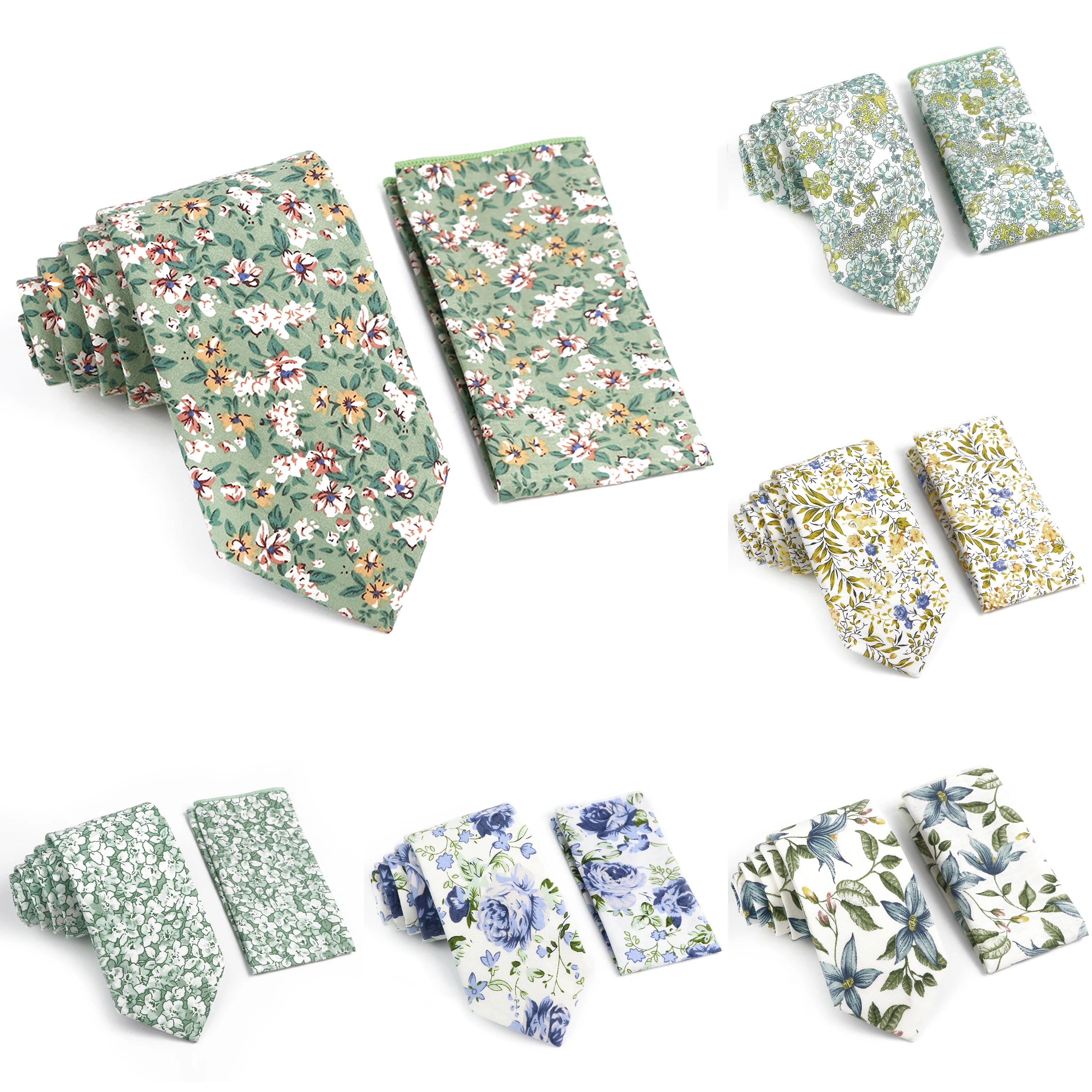 Novelty Floral Cotton Mens Casual Tie Set Fit Wedding Party Yellow Green Blue Necktie Pocket Square Chic Suit Gravata Accessory