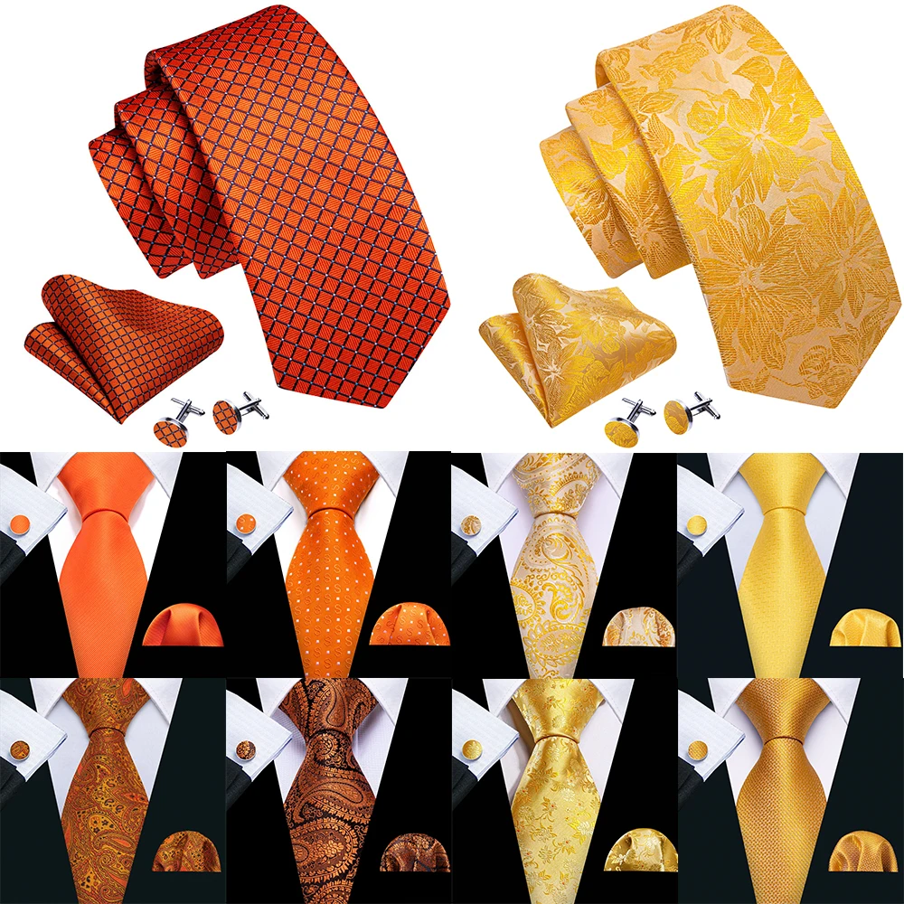 Fashion Orange Yellow Men Tie Luxury Silk Plaid High Quality Pocket Square Cufflinks Sets Groom Wedding Gifts Barry.Wang 6484