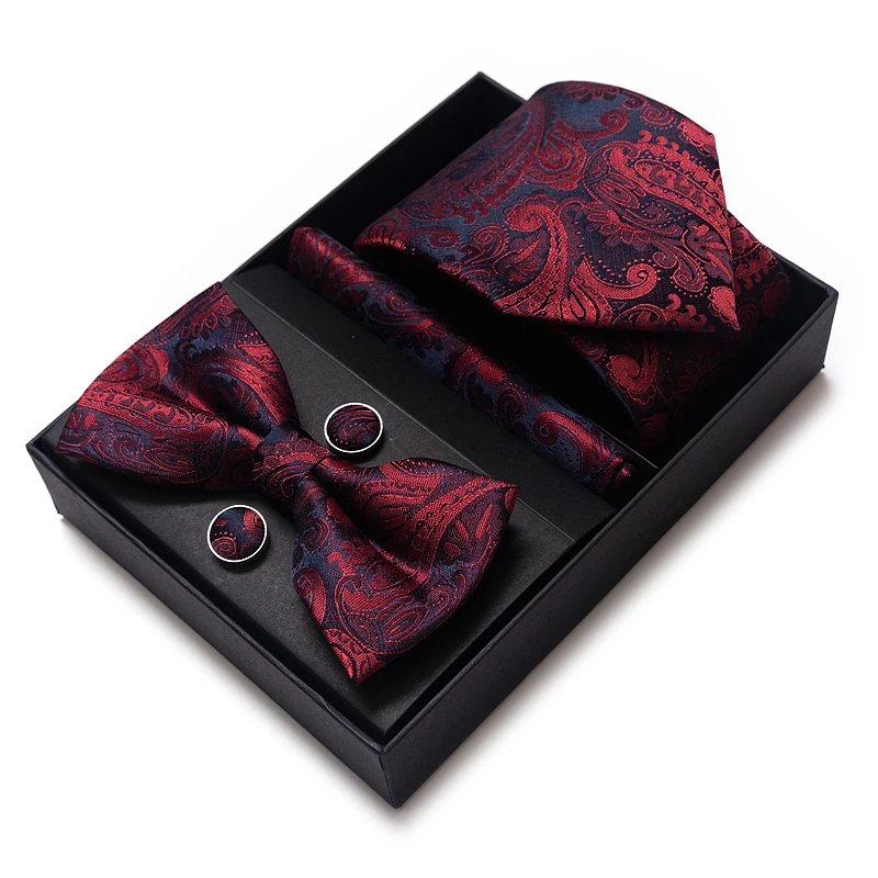 Luxury High Quality Gift Box Tie Hanky Pocket Squares Cufflink Set Necktie Box Red Paisley Suit Accessories Fit Wedding Party