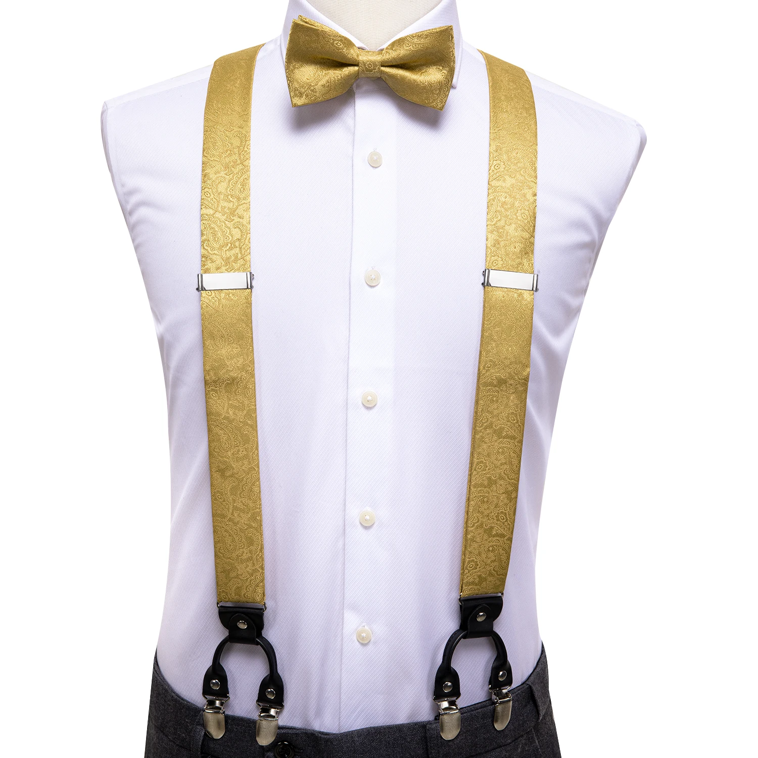 Hi-Tie Jacquard Woven Silk Gold Mens Suspender Braces Bow Tie Hanky Cufflinks Set For Men Adjustable Elastic Galluses for Men